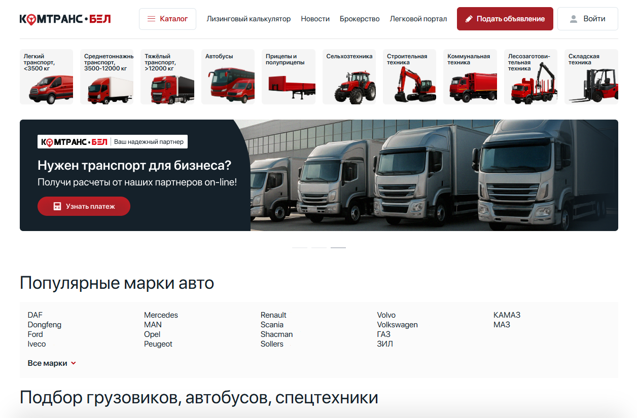 Так родилась идея специализированной площадки Комтранс.бел. Мы создали уникальный инструмент, который позволяет найти технику с помощью подробнейшего конфигуратора и тут же подобрать выгодное финансирование от компаний-партнеров.